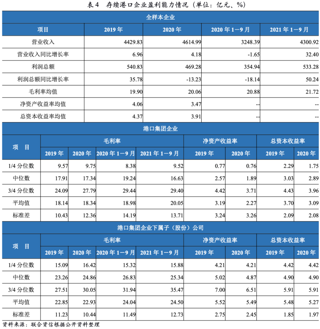 2020年港口企業(yè)總體收入規(guī)模保持增長(zhǎng),但受新冠肺炎疫情影響增速有所下滑,整體盈利能力有所減弱,企業(yè)盈利能力受腹地經(jīng)濟(jì)和貨種結(jié)構(gòu)影響存在差異;2021年前三季度港口企業(yè)收入規(guī)模及利潤(rùn)水平明顯上升。