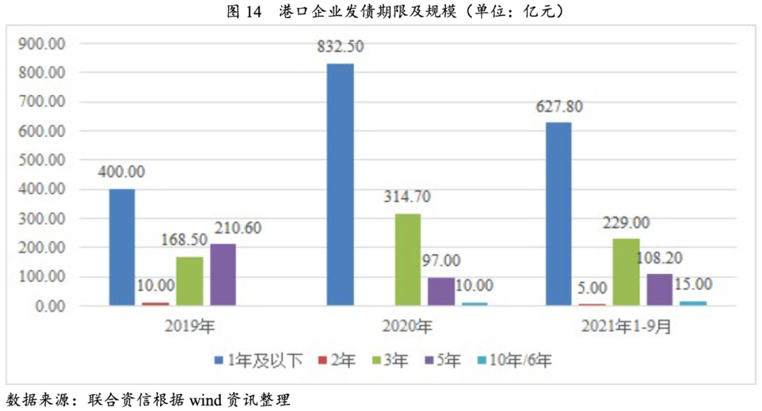 2020年,港口企業(yè)共計(jì)發(fā)行債券172支,發(fā)行期數(shù)同比增長(zhǎng)75.51%;發(fā)行規(guī)模合計(jì)1245.20億元,同比增長(zhǎng)57.80%。2021年前三季度,港口企業(yè)合計(jì)發(fā)行債券135支、發(fā)行規(guī)模1245.20億元,分別較上年同期下降3.57%和3.53%。整體看,2020年以來(lái),港口企業(yè)債券發(fā)行期數(shù)和規(guī)模保持在較高水平。