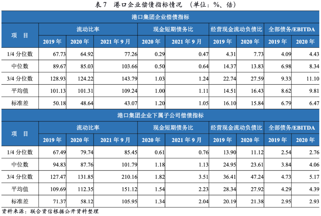 值得關(guān)注的是,港口集團(tuán)企業(yè)負(fù)債水平分化較為明顯,處于后1/4分位的港口集團(tuán)企業(yè)負(fù)債水平明顯偏高,其中6家企業(yè)2021年9月底的全部債務(wù)資本化比率超過(guò)60%。
