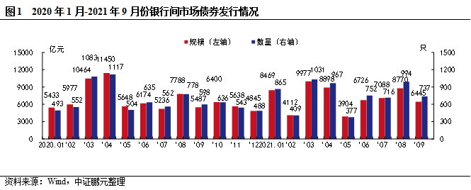 2021年9月,我國銀行間市場共發行信用債券737只,發行規模6,445.12億元,環比分別下降26.74%和27.33%,同比分別上升23.24%和17.46%。