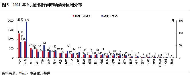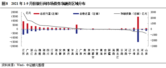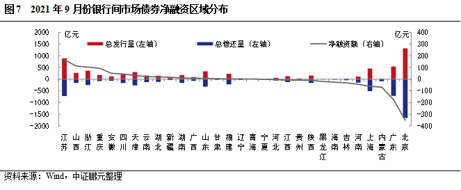 區域分布方面,9月銀行間市場債券發行人主要分布在北京及東部沿海地區,17個省份呈凈融資,13個省份呈凈償還,以江蘇省凈融資規模最大,以北京凈償還規模最大,凈償還規模大于凈融資規模。