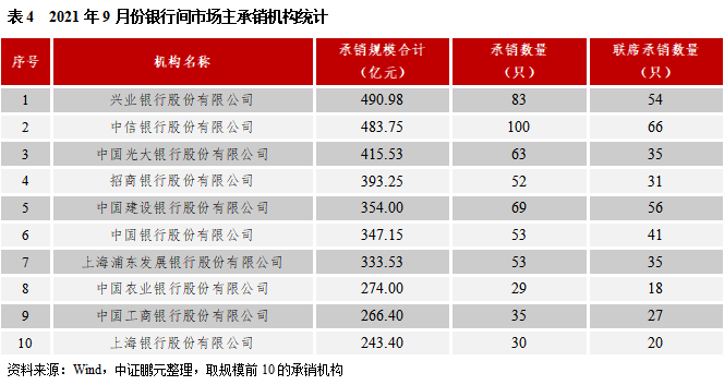 主承銷機構方面,9月共有58家機構參與了銀行間市場的承銷工作,興業銀行以490.98億元的承銷規模位居榜首;銀行間市場承銷機構數量較上月下降,集中度下降。