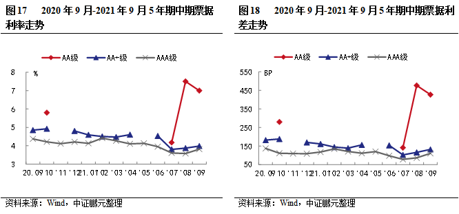 2021年9月份,中期票據的最高發行利率為8.00%,比上月最高發行利率上升50 BP;最低發行利率為2.88%,比上月最低發行利率下降2BP。與2021年8月份相比,AA級、AA+級別、AAA級的平均發行利率分別上升52BP、27BP和42BP;平均利差分別擴大55BP、擴大28BP和收窄43BP。9月份短期融資券的最高發行利率為7.00%,與上月最高發行利率持平;最低發行利率為2.00%,與上月最低發行利率持平。就短期融資券發行級別來看,AA級、AA+級別、AAA級的平均發行利率分別上升35BP、14BP和5BP;平均利差分別擴大18BP、收窄12BP和收窄19BP。