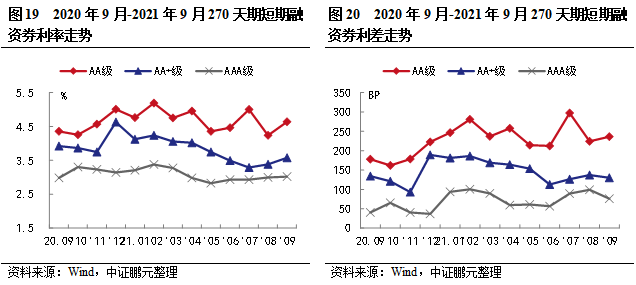 就主要期限品種270天期短期融資券利率和利差走勢來看,2021年9月,AA級、AA+級和AAA級短融平均發行利率分別上行40BP、上行19BP和上行2BP。利差方面AA級、AA+級和AAA級短期融資券平均發行利差分別擴大12BP、收窄7BP、收窄23BP。AA級別利率變動幅度最大,利率上行40BP,AAA級別利差變動幅度最大,利差收窄23BP。綜合1-9月利率利差走勢情況來看,短融利率波動下行,利差收窄。