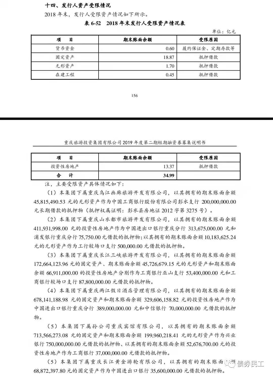 1、由于“20重慶旅投GN001”為PPN,發行材料不公開。債券民工從公開渠道找到了重慶旅投2019年度第二期短期融資券募集說明書作為參考,其中募集說明書對于受限資產部分的描述很簡單,按照會計科目對受限資產的內容進行了簡要介紹。