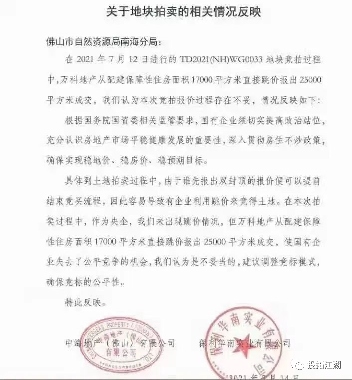 事情的梗概很簡單,就是保利和中海兩家房企,向佛山南海自然資源分局反映情況,話說萬科拿地不講規(guī)則,不按套路出牌,導(dǎo)致國有企業(yè)沒拿地,讓國企喪失了公平競爭的機會。