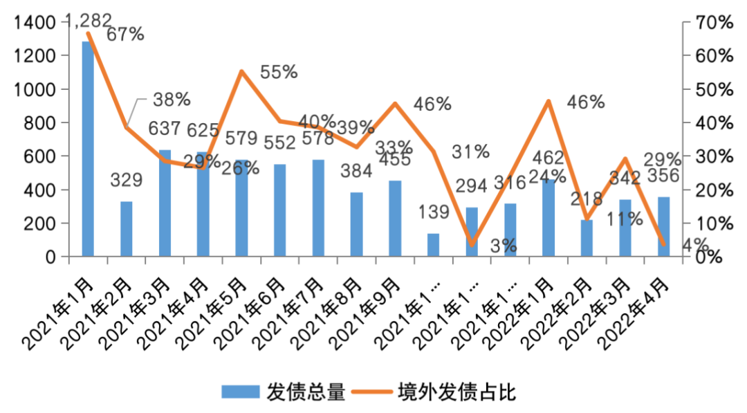 圖:2021年至2022年4月房企發(fā)債總量及境外債占比(億元)