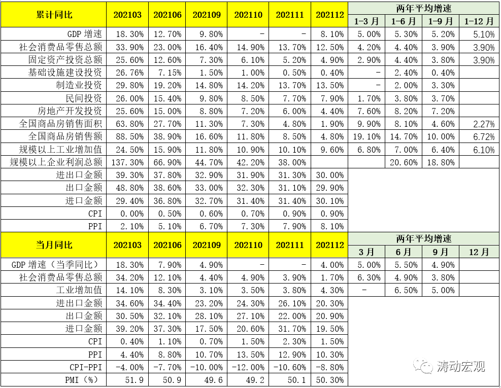 2021年12月政治局會議與中央經濟工作會議(參見2021年中央經濟工作會議釋放十大重磅信號)均明確了2022年的整體宏觀政策基調,即穩字當頭、保住宏觀經濟大盤、政策適度超前,以確保2021年一季度和上半年。宏觀政策基調決定著政策的方向、力度與節奏,經濟基本面的現狀決定著貨幣政策寬松的力度需要加大、節奏需要提前。