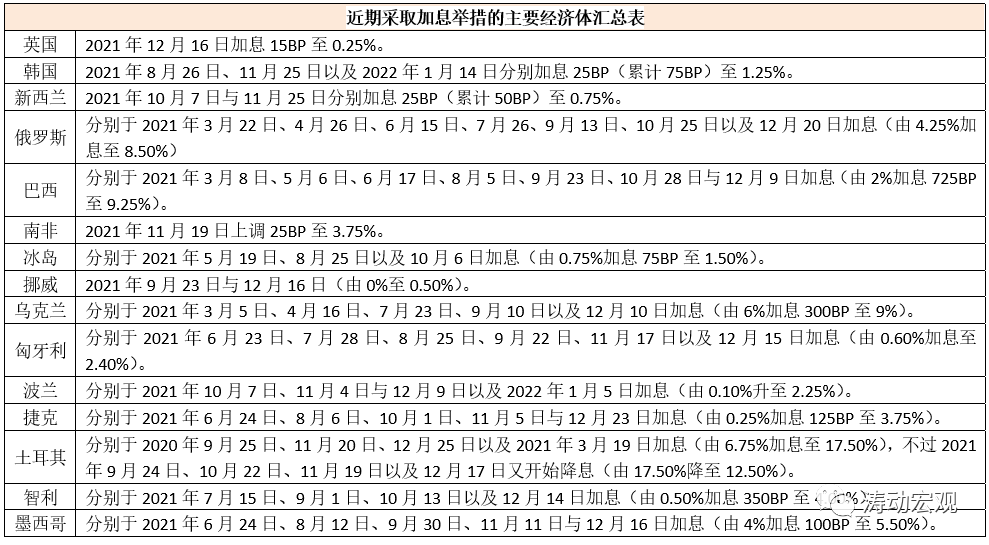 站在當前來看,和上一輪美聯儲政策收緊過程相比,本輪最大的差異在于國內貨幣政策的自主性以及監管政策的高壓性更為突出,同時中國也在匯率方面也有更大的操作彈性和容忍度、通脹對貨幣政策的制約力度明顯下降等。這意味著,當美聯儲Taper進程加快、加息與縮表步伐提前時,中國政策松一松的窗口期實際上是變得更短了,也更緊迫了。畢竟在美聯儲Taper加快的這段時期,中國經濟又出現了新的下行壓力,穩增長壓力正變得越來越突出,中國需要在美聯儲正式加息之前呵護好國內經濟基本面。特別是我們看到,2021年11月以來,已有英國、韓國、新西蘭、巴西、南非、烏克蘭、匈牙利、波蘭、捷克、智利和墨西哥等經濟選擇加息,既包括發展中國家,也包括韓國和新西蘭等發達經濟體。