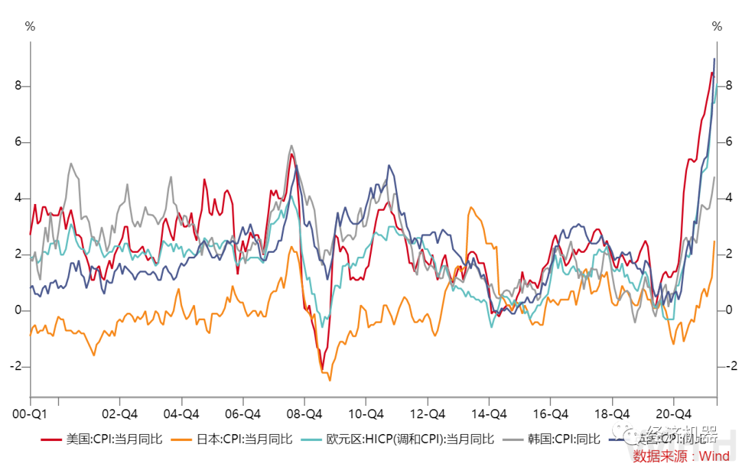 新冠疫情對供應鏈的沖擊和各國實施的寬松政策,使得海外通脹年初便開始抬頭。2月,俄烏沖突又添了一把火,海外各國均面臨嚴重的通脹壓力,5月各國CPI同比均逼近20年來高位(9圖)。