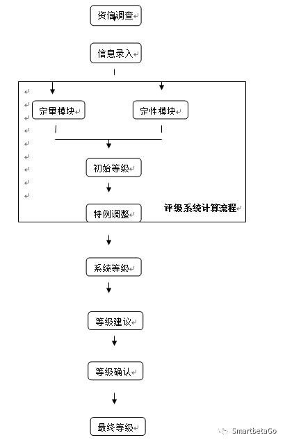 評級系統首先進行定性模塊和定量模型的計算,得到出事違約概率和信用等級,進一步按照特例調整的計算規則,得到系統評級和對應違約概率。