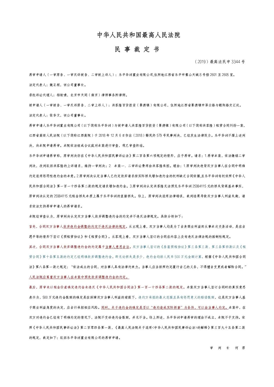 華潤公司與洪客隆百貨租賃合同糾紛一案由江西省高級人民法院(以下簡稱“江西高院”)作出(2018)贛民終579號民事判決書結(jié)案,判決已生效,華潤公司不服江西高院的生效判決,向最高人民法院申請再審。最高人民法院于2019年8月30日作出(2019)最高法民申3344號民事裁定書,駁回了華潤公司的再審申請。