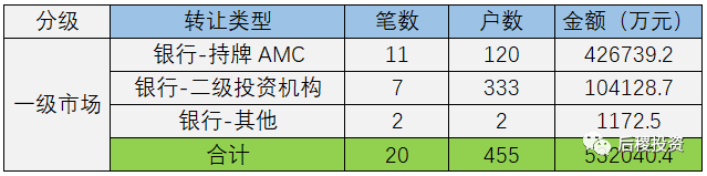 根據已有數據顯示,一級市場總成交455戶,總成交金額約53億余元,成交規模最大的為銀行-持牌AMC,成交金額在一級市場中占80.9%。對比18年,一級市場出讓總額減少約8億元,其中銀行-持牌AMC出讓金額減少15億元;銀行-二級投資機構出讓金額增加8億元。