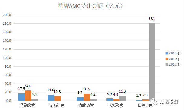 從年份上看,17年持牌AMC受讓銀行資產體量最大,其中以信達資管為最,17年信達受讓181億元,占當年一級市場受讓方83%;從個體上看,也是信達資管表現最為亮眼,經歷17年大規模受讓債權后,18、19兩年受讓金額大幅度下降,幾近為零,華融資管與湖南資管都是18年受讓金額明顯增加,17、19年相較平穩,東方資管受讓金額逐年增加。