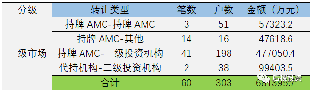 根據已有數據顯示,二級市場總成交303戶,總成交金額68億余元。成交規模最大的為持牌AMC-二級投資機構,成交金額在二級市場中占70%。對比18年,二級市場總量增加約23億元,其中持牌AMC-二級投資機構增加17億元;持牌AMC-其他減少10億元;代持平臺-二級投資機構增加8億元。