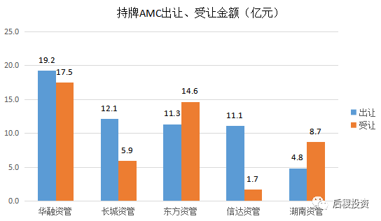 對比2018年,2019年持牌AMC總出讓金額增加約15億元,總受讓金額減少約18億元。華融資管、長城資管、信達資管出讓金額大于受讓金額,東方資管、湖南資管出讓金額小于受讓金額。