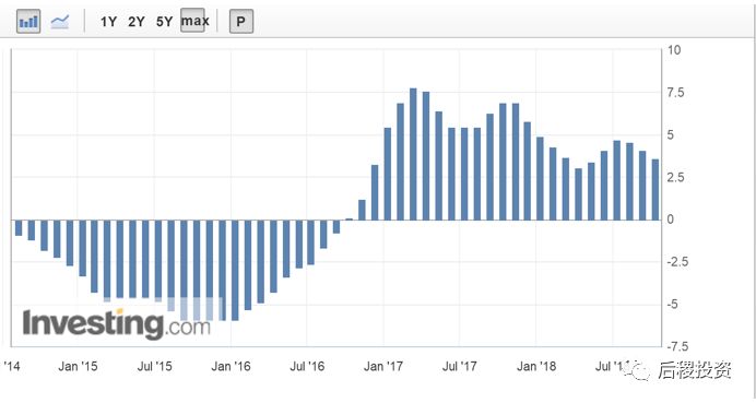 中國生產者物價指數(PPI) (同比),自2016年1月開始,從增長-5.9%一路上行至2017年3月的7.8%,并一直高位維持了一年左右。