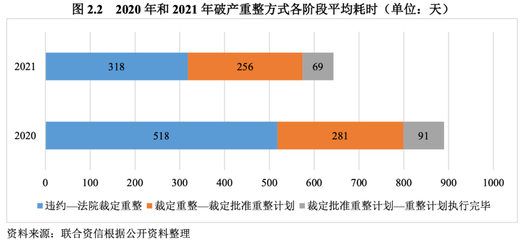 從破產重整處置效率來看,2021年法院共裁定23家[9]違約發行人進入破產重整程序,其違約日至法院裁定破產重整日的平均耗時為318天,較2020年(518天)縮短了200天;2021年處于執行重整計劃階段的17家發行人中,法院裁定重整申請日至批準重整計劃日的平均耗時為256天,較2020年(281天)有所縮短;2021年重整計劃執行完畢的發行人共2家,其批準重整計劃至重整計劃執行完畢平均耗時69天,較2020年(91天)有所縮短。整體來看,破產重整處置效率整體較2020年有所提升。