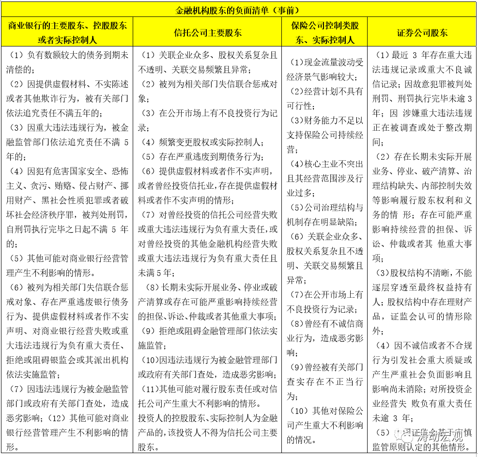 《商業銀行法(建議修改稿)》以及各類金融股權管理辦法均列示了對應金融機構股東的負面清單,這兩年有一個最明顯的變化是對透明度和可穿透提出了新要求,如信托公司的主要股東、保險公司控制類股東及實際控制人應沒有“關聯企業眾多、股權關系復雜且不透明、關聯交易頻繁且異常”,證券公司股東還應規避“股權結構不清晰,不能逐層穿透至最終權益持有人”等情形。