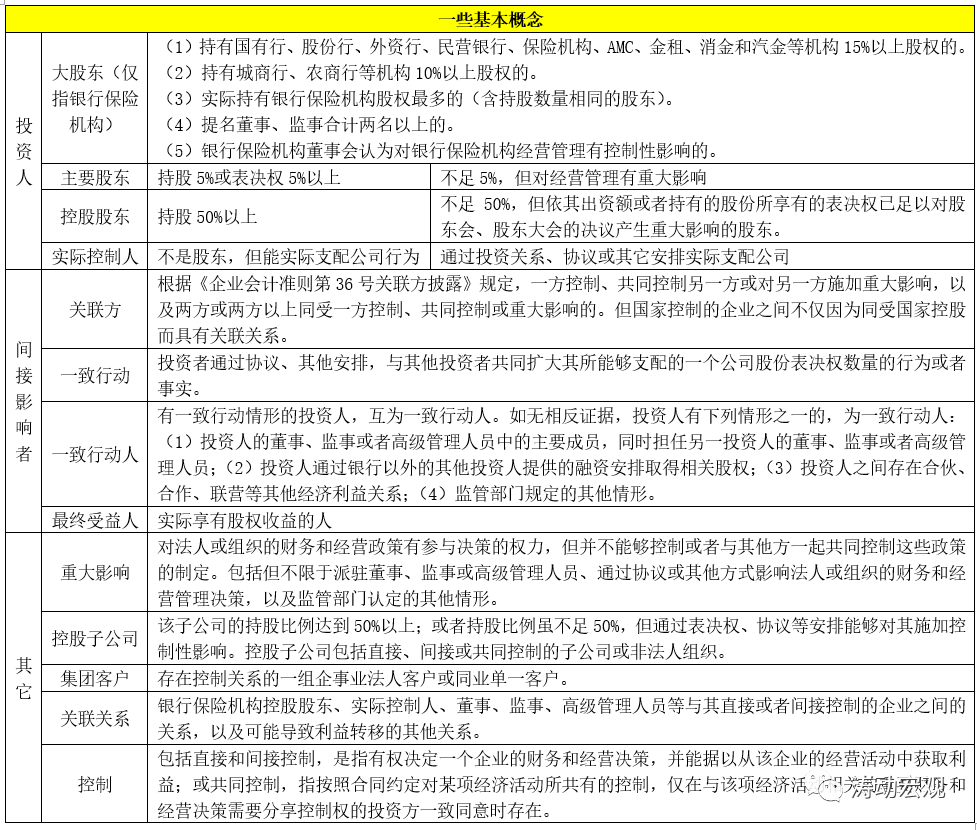 首先需要明確金融機構股東的相關當事人等基本概念,具體如主要股東、控股股東、實際控制人、一致行動(人)、最終受益人和重大影響等。這些概念大都源自《中華人民共和國公司法》和《企業會計準則第36號關聯方披露》。