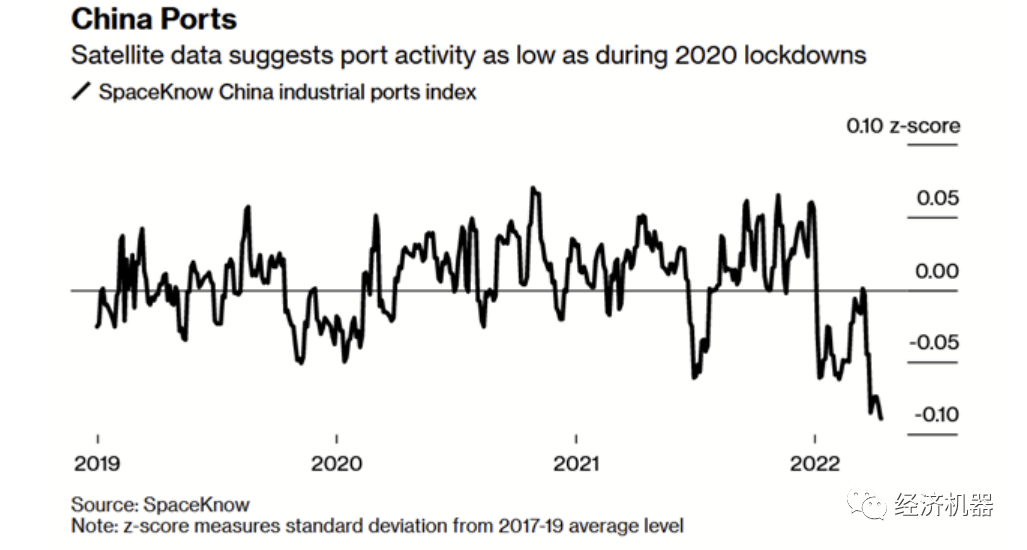 疫情再次擴大,對出口增速放緩影響不可忽視。一方面,本輪疫情的“震中”在我國的“經濟心臟”—上海,背靠我國乃至世界供應鏈的中心長三角經濟帶,對外貿出口至關重要。上海作為疫情重災區,上海港的供應鏈面臨巨大壓力。據衛星數據顯示,此次疫情對港口物流的影響比以往更加嚴重(圖2)。