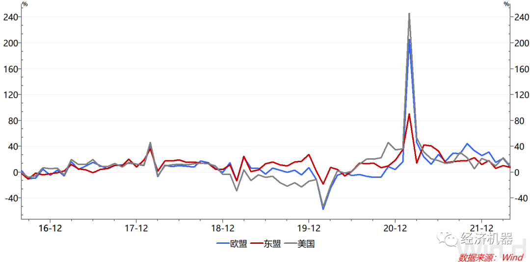 圖1、中國對美、歐、東盟出口:同比增速