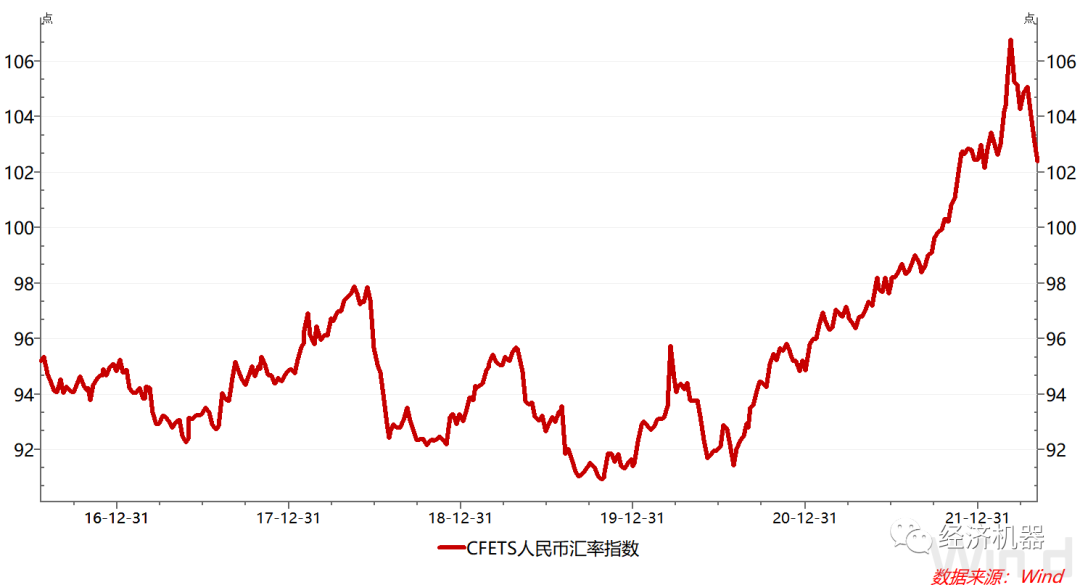 期間,人民幣匯率也表現的十分強勢,2020年以來對美元持續升值。CFETS人民幣匯率指數也由2020年7月的92最高升至2022年3月的106.8,漲幅約16%。