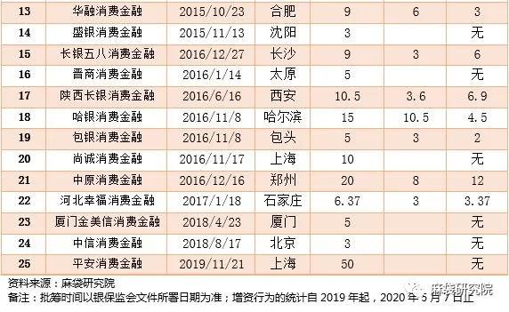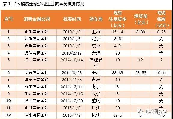 25家已開業消費金融公司、地區、注冊資本及近期增資情況如表1所示: