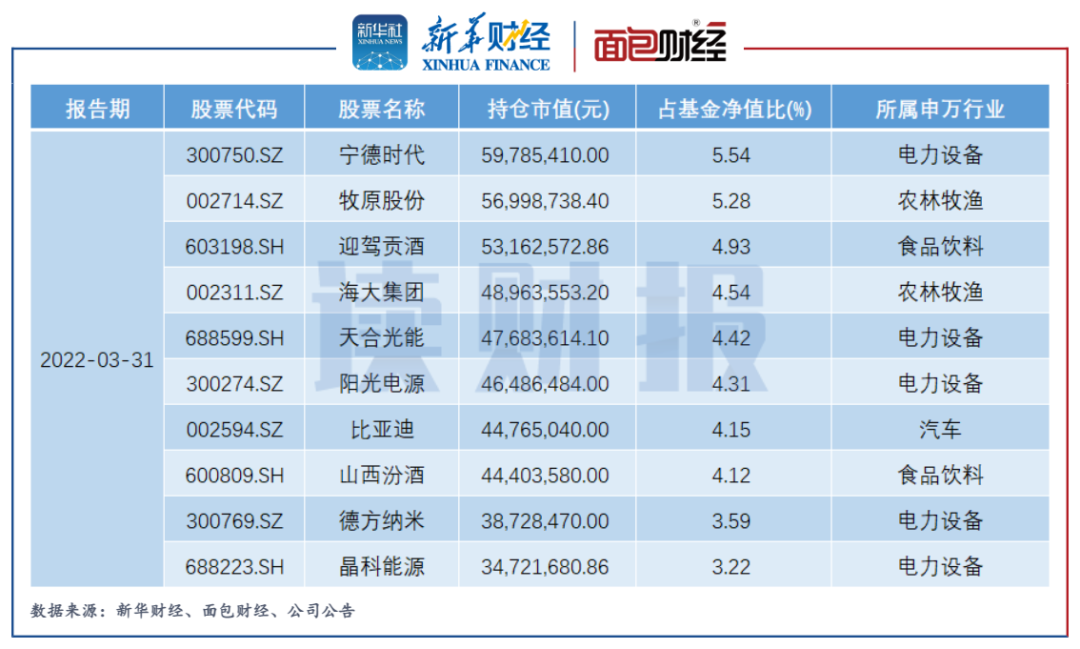 2022年一季報顯示,招商興和優選的前十大持倉中,五只股票屬于申萬電力設備行業,包括寧德時代、天合光能、陽光電源、德方納米以及晶科能源,這些公司均屬于新能源汽車、光伏產業鏈。除了這5家企業,該基金前十大持倉中還包括新能源車企比亞迪。