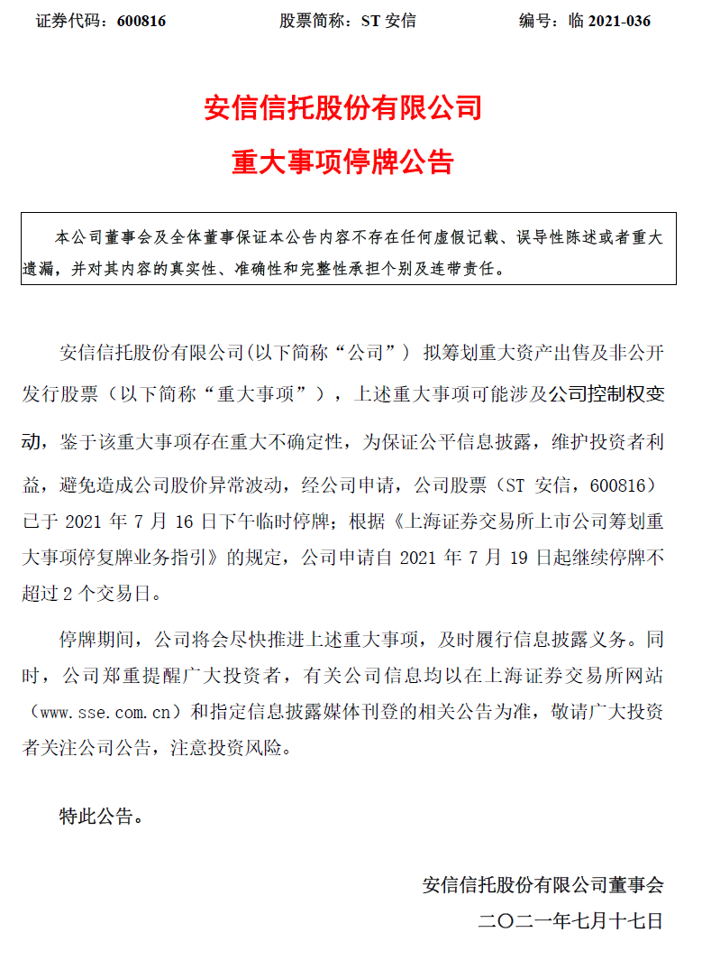 就在今天晚間的時候,ST安信發(fā)布公告稱:公司擬籌劃重大資產(chǎn)出售及非公開發(fā)行股票,該重大事項可能涉及公司控制權(quán)變動,鑒于該重大事項存在重大不確定性,為保證公平信息披露,維護投資者利益,避免造成公司股價異常波動,經(jīng)公司申請,公司股票已于2021年7月16日下午臨時停牌;公司申請自2021年7月19日起繼續(xù)停牌不超過2個交易日。停牌期間,公司將會盡快推進上述重大事項,及時履行信息披露義務(wù)。同時,鄭重提醒廣大投資者,有關(guān)公司信息均以上海證券交易所和指定的信息披露媒體刊登的相關(guān)公告為準(zhǔn),敬請廣大投資者關(guān)注公司公告,注意投資風(fēng)險。看到這里不得不感嘆,安信信托重組總算有了實質(zhì)性的進展,雖然還有很長很長的路要走。于是馬不停蹄地打開電腦,寫下這篇文章。二.有跡可循的重組
