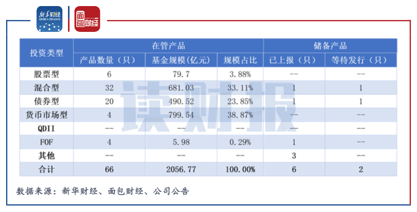 同期,農銀匯理在管公募基金共有66只。從產品類型來看,混合型基金和債券型基金最多,分別有32只、20只;貨幣型基金的管理規模最大,達到799.54億元,占總規模的38.87%。儲備產品方面,已上報產品有6只,等待發行的產品有2只。