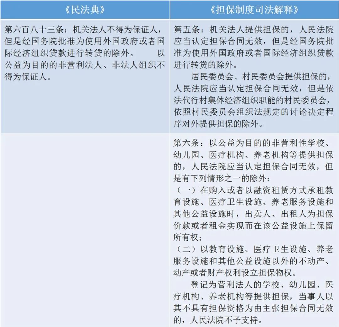(3)從擔保人主體資格方面判斷,法律明確將除特殊情況外不得提供擔保的主體限定為國家機關及以公益為目的的營利性法人和非法人組織, 村民委員會、居民委員會等基層群眾自治組織。若上述主體違反法律規定的情形提供擔保,則認定擔保合同無效,此情形下的擔保責任依據《擔保制度司法解釋》第十七條進行分配,擔保人無過錯的,擔保人不承擔賠償責任。法條鏈接: