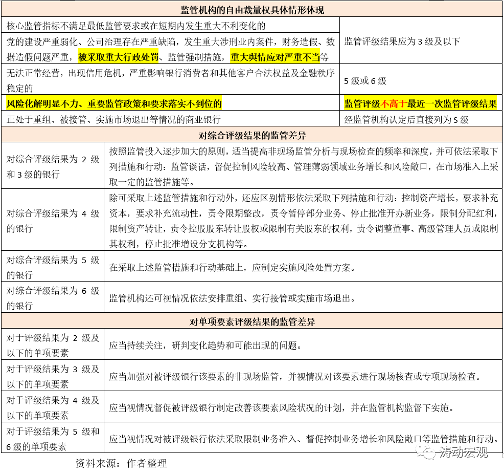 (5)監(jiān)管機構(gòu)可根據(jù)評級結(jié)果的差異,采取不同的監(jiān)管舉措,一般根據(jù)評級檔次的高低,按照監(jiān)管投入逐步加大的原則,適當提高監(jiān)管力度。目前來看,只有評級結(jié)果為1級的銀行,才可以豁免相應監(jiān)管。