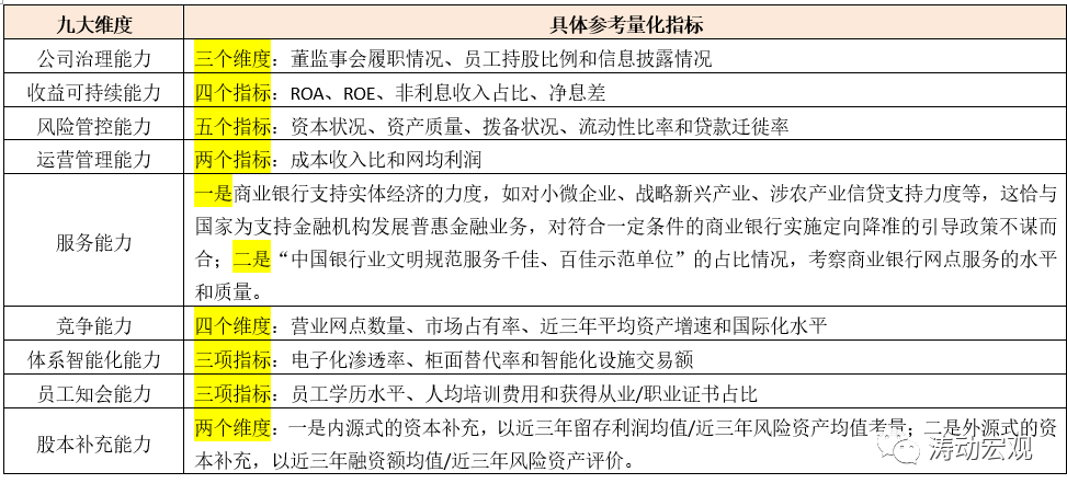 監(jiān)管評級之外,始于2015年的陀螺評價體系這里也略微提及一下。2013年中國銀行業(yè)協(xié)會成立課題組進行研究,并于2015年正式推出“陀螺”(GYROSCOPE)評價體系,從公司治理能力(Governance)、收益可持續(xù)能力(Yield sustainability)、風險管控能力(Risk control)、運營管理能力(Operational management)、服務(wù)能力(Service quality)、競爭能力(Competitiveness)、體系智能化能力(Organizational intellectualization)、員工知會能力(Personnel competence)、股本補充能力(Equity funding)等九個維度32項指標入手,對全國性銀行與地方性銀行進行綜合評價。不過這幾年,陀螺評價體系的影響力和受到的關(guān)注度有下降的趨勢。