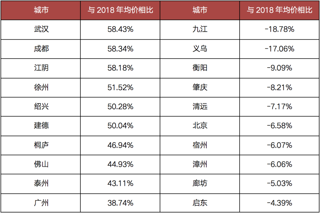 若是把房價漲跌幅范圍控制在-10%至10%區間,在全部重點關注的城市中有約33個城市的房價接近2018年。其中九江、義烏兩城因為跌幅超出10%范圍沒有計算在列。