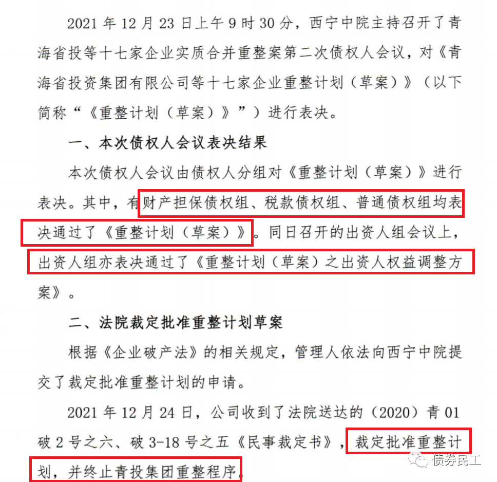2021年還有個(gè)一非AAA的國有企業(yè)完成了債務(wù)重整計(jì)劃。雖然歷史最高主體信用等級(jí)只有AA,但是屬于省級(jí)國有企業(yè),對(duì)于信用市場的影響并不小,這個(gè)發(fā)行人就是青海省投資集團(tuán)有限公司。2021年12月27日,青海省投資集團(tuán)有限公司公告,2021年12月23日財(cái)產(chǎn)擔(dān)保債權(quán)組、稅款債權(quán)組和普通債權(quán)組均表決通過了《重整計(jì)劃(草案)》;2021年12月24日,西寧中院批準(zhǔn)了重整計(jì)劃。青海省投資集團(tuán)有限公司目前最新主體信用等級(jí)為C,已經(jīng)實(shí)質(zhì)違約債券只數(shù)為2只,已經(jīng)實(shí)質(zhì)違約債券金額為10.08億元。