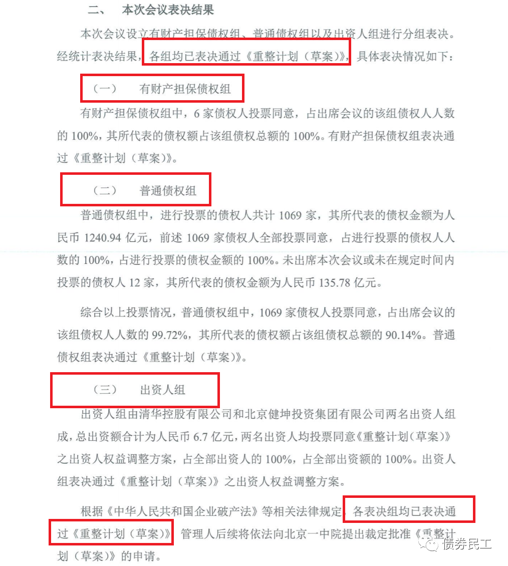 3、2021年12月29日,紫光集團(tuán)有限公司(公告,有財(cái)產(chǎn)擔(dān)保債權(quán)組、普通債權(quán)組和出資人組分別表決,均已經(jīng)通過了《重整計(jì)劃(草案)》。目前,該重整計(jì)劃尚需經(jīng)北京一中院批準(zhǔn)。紫光集團(tuán)有限公司歷史最高主體信用等級(jí)為AAA,目前最新主體信用等級(jí)為C,已經(jīng)實(shí)質(zhì)違約債券只數(shù)為9只,已經(jīng)實(shí)質(zhì)違約債券金額為140.46億元。