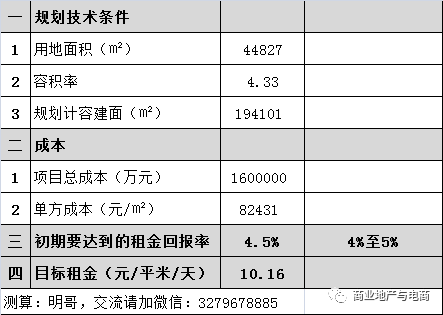 該地塊計容建面194101平米,總成本160億,折合單方82431元/平米,假設初期租金回報率要求4.5%,則目標租金水平為: