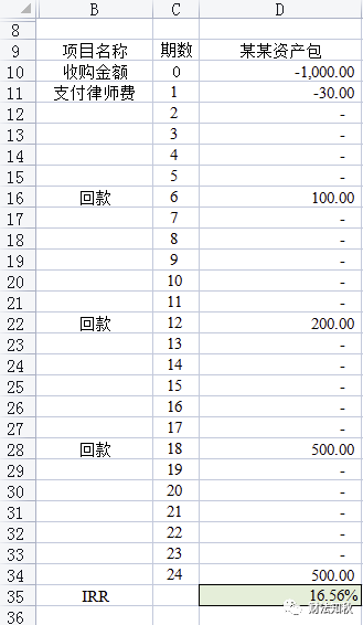 基于不良資產投資的特性:投資周期長、現金流波動大,投資期內多次投入,多次回現。為了充分反映資金的時間價值,測算收益率時建議使用內部收益率IRR法來進行計算不良資產投資的收益率。
