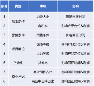 規(guī)劃條件、預(yù)售條件、項目區(qū)位、貨地比、商業(yè)占比,這五個因素中對利潤影響最大的因素和我們的以往的認(rèn)識不同,但是對現(xiàn)金流的影響是比較直接的。