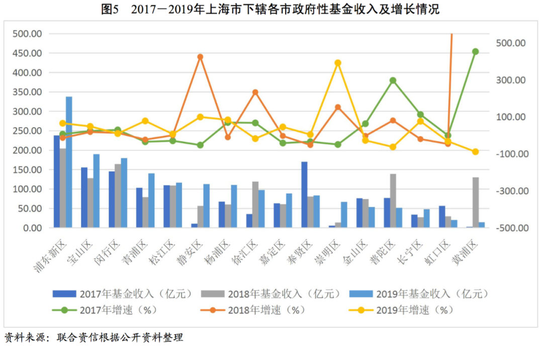 政府性基金收入方面,上海市城市基礎設施建設相對完善,各轄區政府性基金收入受相關政策及土地出讓市場行情影響整體規模相對較小且存在較大波動,浦東新區由于可出讓土地資源豐富且外部需求強烈,因此政府性基金收入規模較大,2019年為337.45億元。2019年,寶山區、閔行區、青浦區、奉賢區、楊浦區和松江區政府性基金收入均在100至200億元之間,且保持不同程度的增長。同期,黃浦區、徐匯區、普陀區、虹口區、金山區政府性基金收入均呈現負增長,其中虹口區和黃浦區政府性基金預算收入規模相對較小,分別為20.17億元和14.33億元,主要是由于核心城區開發程度高、可出讓土地面積小所致。