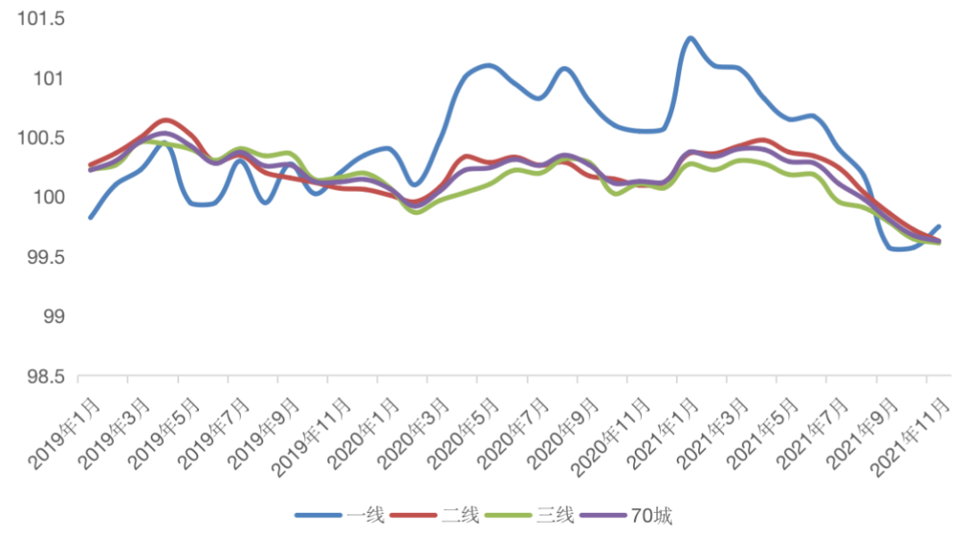 從全國70個大中城市商品住宅銷售價格來看,2021年11月份,70個大中城市商品住宅銷售價格環比延續下降態勢,同比漲幅持續回落。