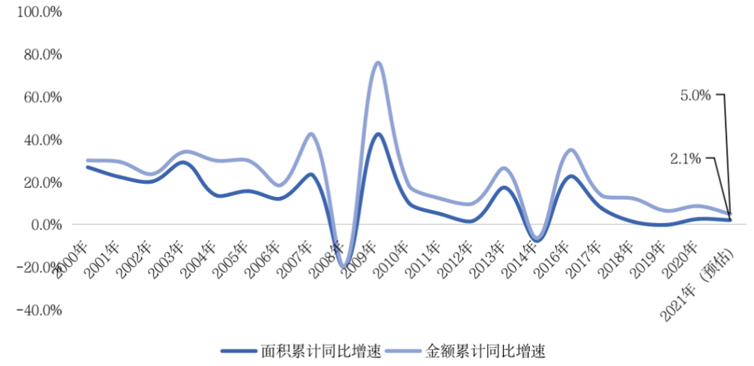 全國歷年商品房銷售面積、銷售金額同比走勢(單位:%)