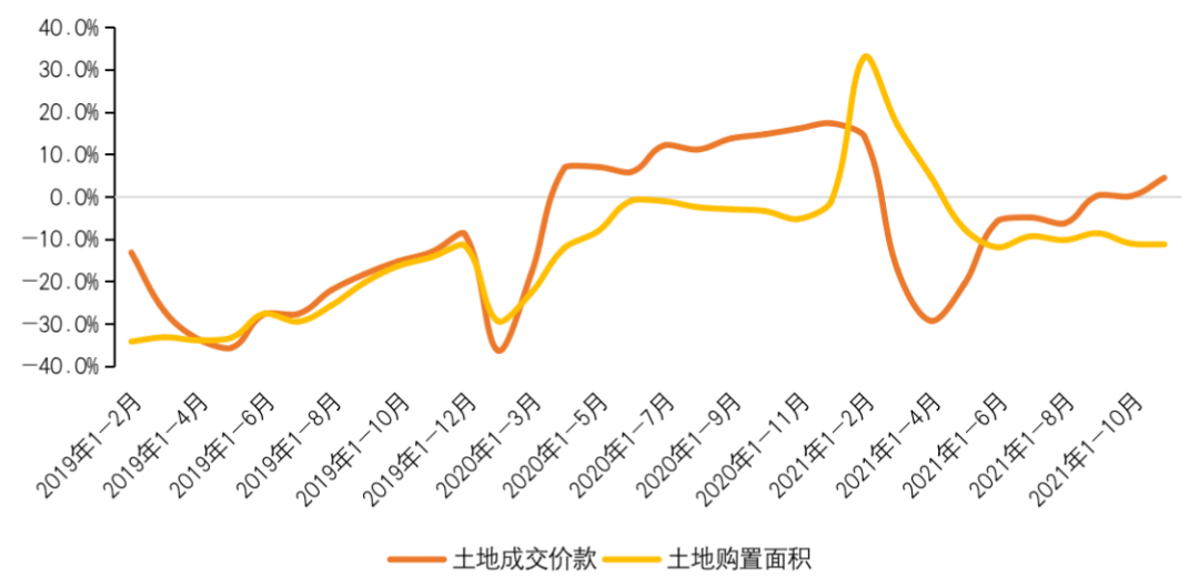 國家統計局數據顯示,1-11月,房地產開發企業土地購置面積18287萬平方米,同比下降11.2%;土地成交價款14519億元,增長4.5%。11月多個核心城市第三輪集中供地,因此土地成交價款結構性提升。但從土地購置面積和各城市土拍成交多以城投公司托底來看,土地市場已經進入到了冰點。房地產資金面收到嚴控下,民營開發企業多已無力購置土地,受此影響下土拓投資已難再支撐整體行業投資規模。