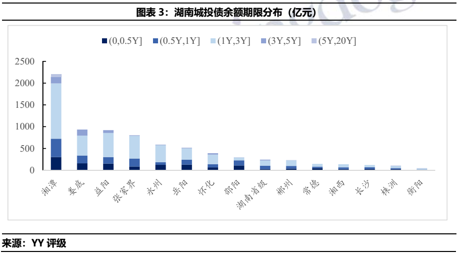 存量而言,長株潭和環洞庭湖區域存量高,湘西存量規模小;結構方面,協會產品、公司債、企業債占比分別是48%、33%和17%;多數地級市存量債多為協會產品,湘西州、邵陽、郴州企業債量稍高。期限而言,期限存量而言,相關債券到期(含行權)均集中于3年內。其中一年內到期壓力最高的區域為湘潭(占比77.13%)、婁底(57%)、益陽(55%)。