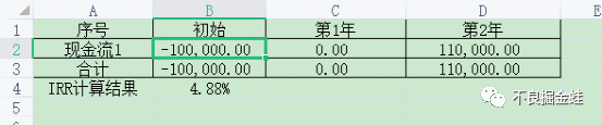 首先,打開你電腦中的EXCEL或者WPS表格,根據案例1輸入對應現金流,在B4單元格輸入公式:=IRR(B3:D3)回車(保留倆位小數)。