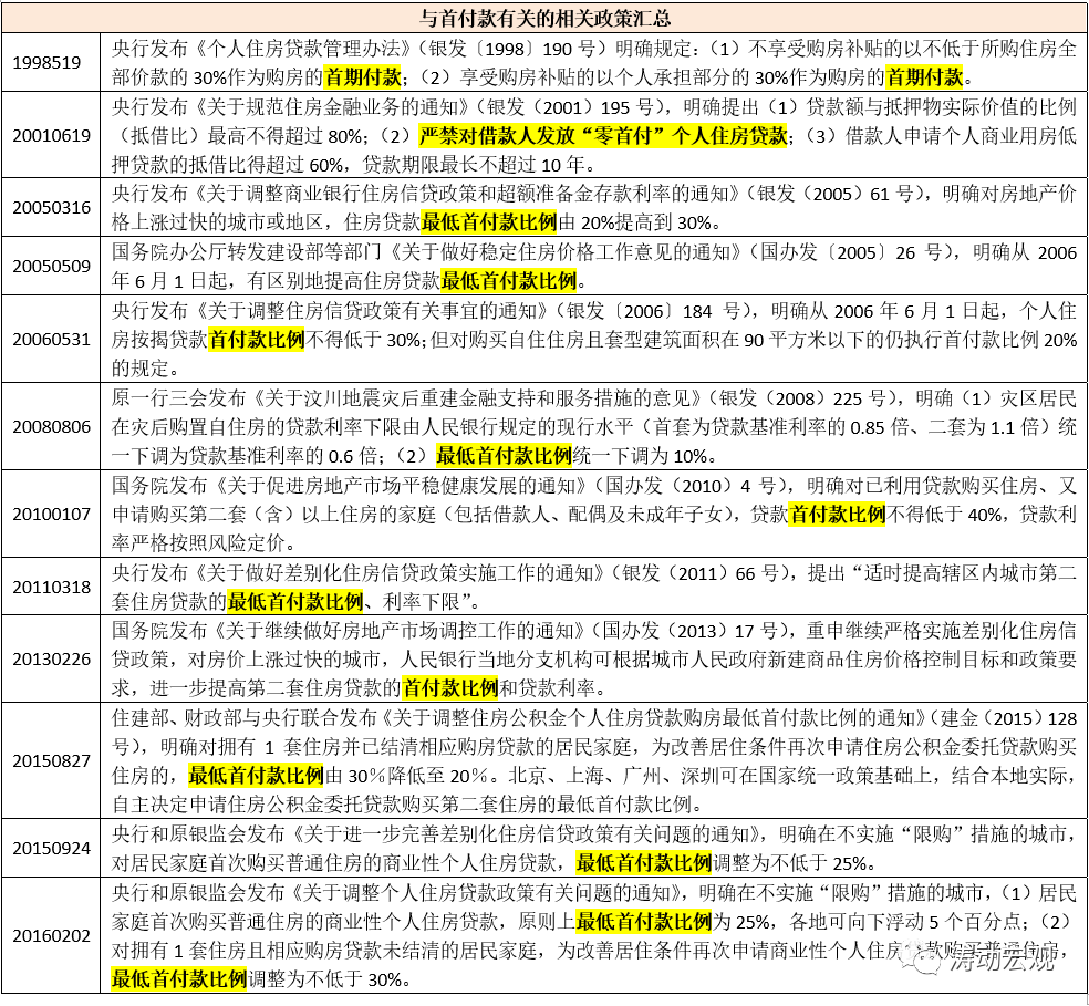 1998年以來,為支持住房金融業(yè)務發(fā)展,央行發(fā)布了一系列政策和規(guī)定,并對最低首付比例提出相應要求,隨后根據不同階段的住房金融調整方向對最低首付比例進行調整,大致的比例主要有20%、25%、30%等等。