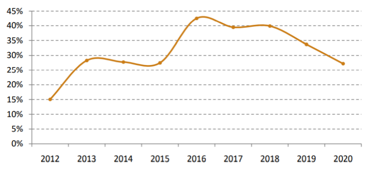 易居研究院數據顯示,今年前三季度,全國房貸占比為27.2%。從歷史數據來看,2016 年前三季度該指標創新高,達到42.5%的水平。隨后受房地產和金融市場的調控,該指標總體趨于下行態勢,2017-2019年前三季度該指標分別為 39.5%、39.9%和 33.7%,2020年前三季度繼續回落。