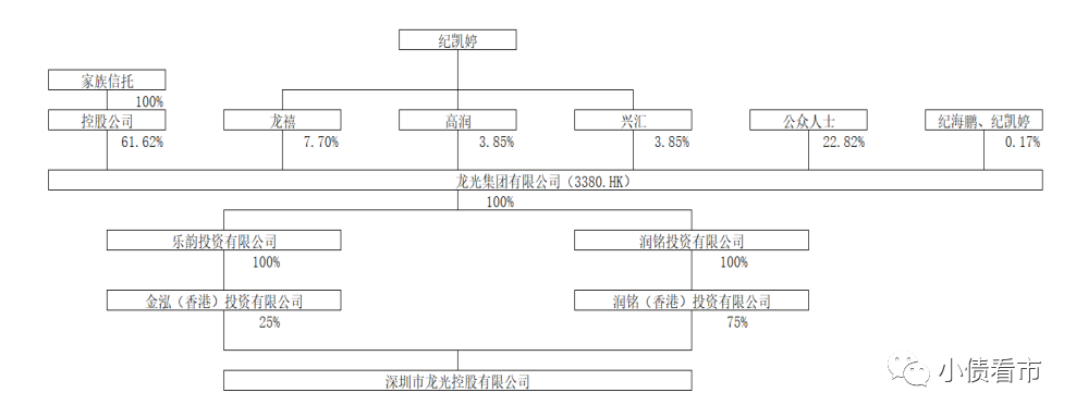 從股權結構看,紀海鵬和女兒紀凱婷通過家族信托實際控制龍光集團,是龍光實際控制人。