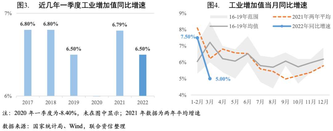 3月工業生產低迷拖累一季度整體增速。2022年一季度,在一系列工業經濟增長政策措施持續作用下,工業經濟運行總體平穩,規上工業增加值同比增長6.50%,1-2月工業生產增長總體較為強勁,3月受疫情防控措施影響,部分企業出現減產停產,物流供應鏈受到沖擊,工業增加值同比增速大幅回落至5%,明顯低于季節性水平,拖累一季度整體增速。